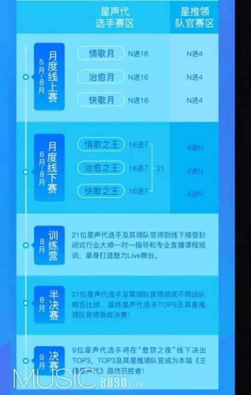 通过线上线下层层比拼,从三场月度赛中胜出的21强选手赢得半决赛资格,并将进入封闭式训练营,接受行业大师一对一指导和专业直播课程培训,打造个人专属魅力舞台。在半决赛竞演舞台上,21强选手们将通过组队表演和solo表演抢夺晋级总决赛的9个名额。闯关到最后阶段的9强选手们将在总决赛中开启巅峰之战,领队帮唱和solo表演等环节分数总和将直接决选出本届《主播星声代》的最终获胜者。