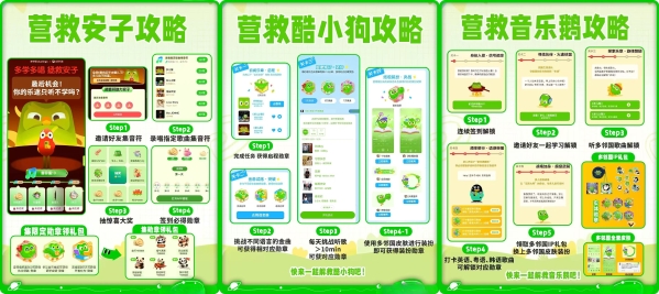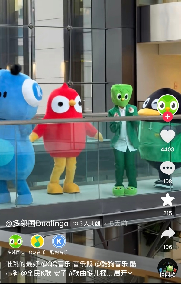 活动的序幕,由一支悬念拉满的先导片强势拉开。片中,多邻国IP形象“多儿”将TME旗下三大萌系IP——QQ音乐“音乐鹅”、酷狗音乐“酷小狗”、全民K歌“安子”集体“强势带走”。这一出充满反差感的剧情,瞬间勾起用户好奇心。紧接着,双方联合发布拟人化 “事件通报”,用趣味口吻宣告:因广大用户“只听歌不学习”沉迷听歌、疏于学习,多儿决定发起“劝学行动”,唯有完成趣味音乐任务,才能解救三小只。这一极具网感的设定,迅速引爆社交话题。#多邻国绿鸟音乐劝学#、#全网摇人听歌解救音乐圈#等话题火速登上微博、抖音等多平台热搜榜,成为关注焦点,为活动奠定了巨大的声量基础。如果说悬念营销是吸引用户的“敲门砖”,那么游戏化任务设计就是留住用户的核心密码。多邻国联动QQ音乐、酷狗音乐、全民 K歌三大平台,上线“解救三小只”专属任务:用户通过参与虚拟小人、金曲挑战赛、K 歌赢金币、兑换联名 IP 礼包、解锁限定勋章等一系列操作,一步步推动剧情进展,最终完成“解救任务”。