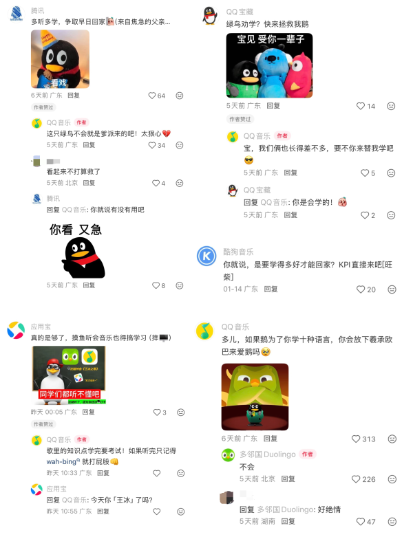 本次活动迅速出圈的核心驱动力,在于对品牌IP的深度人格化运营。多邻国多儿的“可爱劝学”形象愈发鲜活,TME旗下三大IP也摆脱静态logo的刻板印象,化身能引发用户共情的“伙伴”。通过赋予IP拟人化的动机和行为,品牌间的互动被打造成追剧式的趣味剧情,极大弱化了营销的生硬感。同时,多邻国与三个音乐IP借助各自形象特点,创新打造了「音乐劝学」专辑,其中《多儿摇》、《多儿之歌》两首主题歌曲一经上线即引发大量乐迷的评论互动,迅速冲上音乐平台热歌榜。
